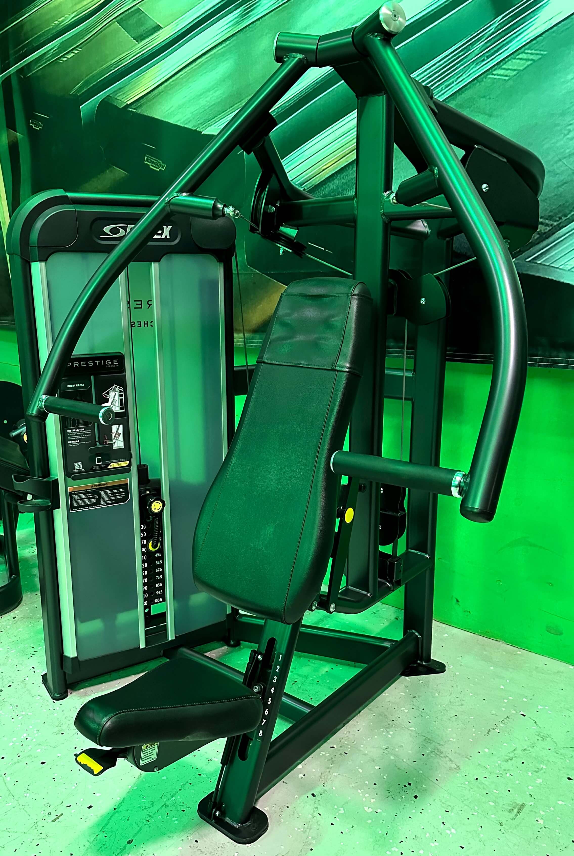 Sittande bröstpress med svagt inåtgående oberoende rörelse. Flertalet olika greppmöjligheter. Justerbart startläge. Sätet svängs enkelt åt sidan för snabb åtkomst med rullstol.