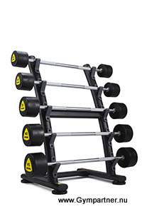 - Detta ställ för set med fasta skivstänger är ett mycket uppskattat komplement på gymmen, där de fasta skivstängerna i tio olika tyngder på ett smidigt sätt kan användas vid olika övningar som bicepscurls, tricepspressar, axelpressar etc.