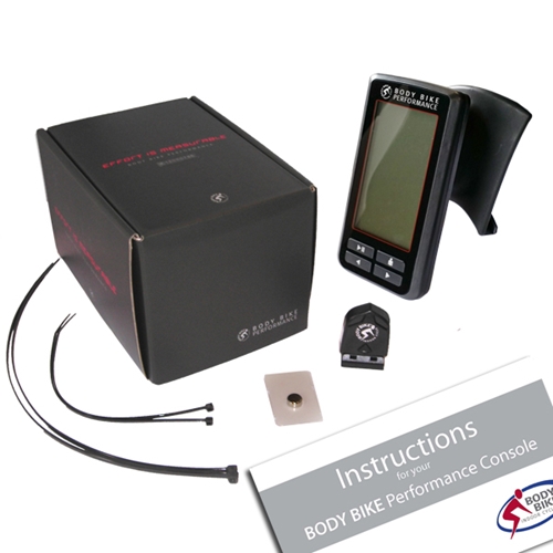 Lådan innehåller BODY BIKE® -konsol inkl. batterier, Wave-flaskhållare- eller styrfäste, hastighetsgivare inkl. batterier, magnet, slipsar och lättläst manual.