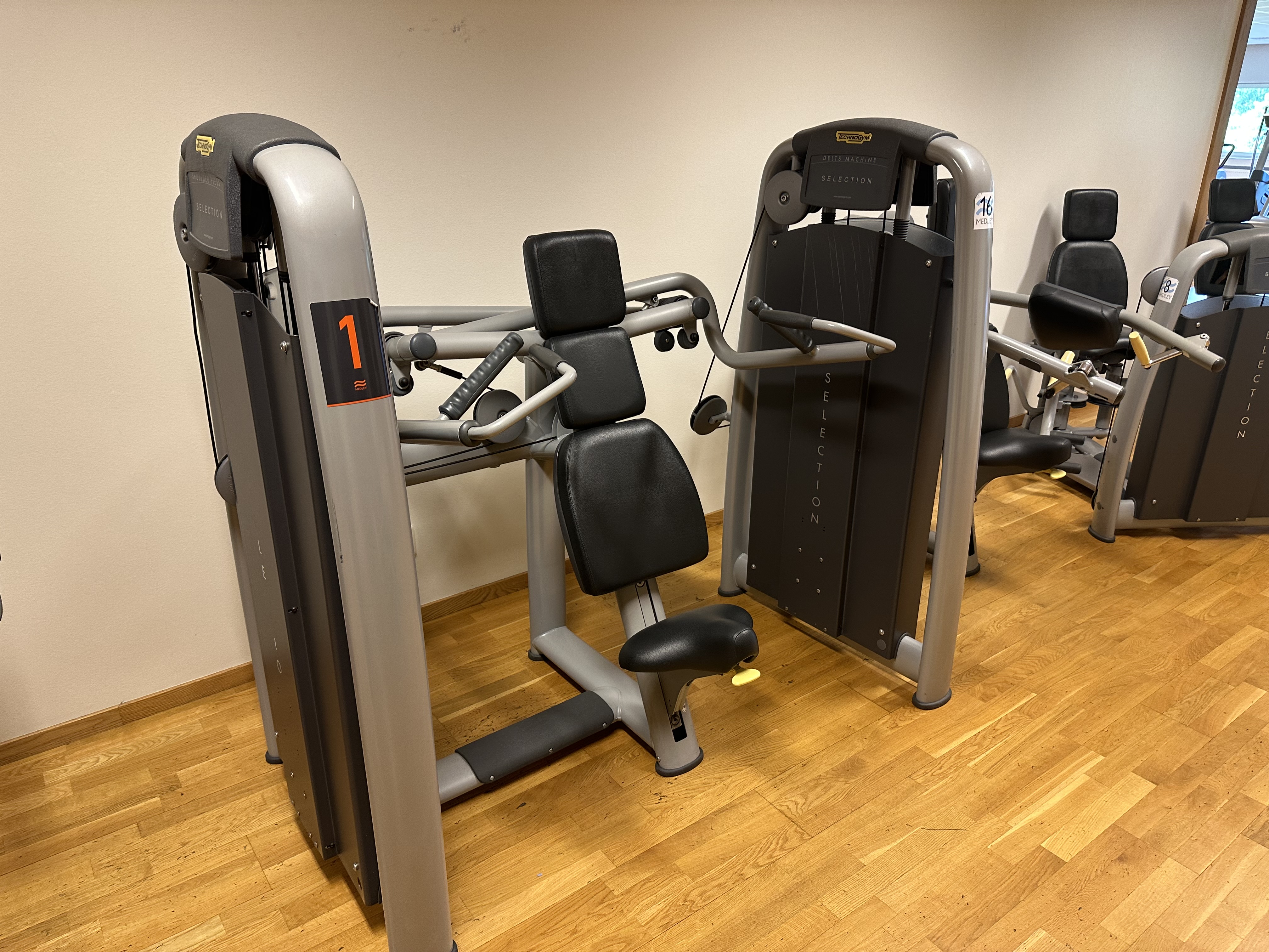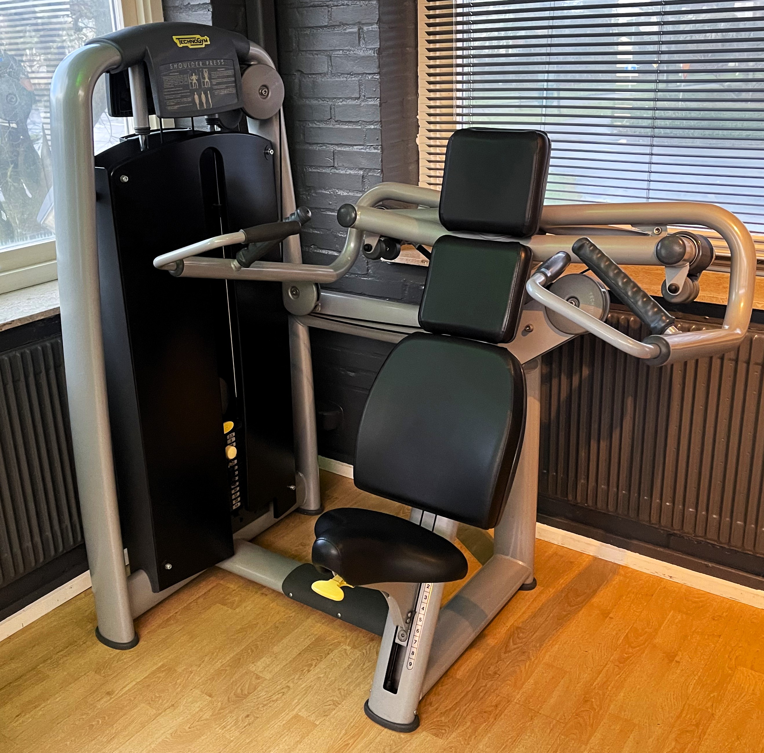 Axelpress Selection line Blå dynaTechnogym. Den här maskinen kan göra underverk med den främre axelmuskulaturen. Rörelsekurvan, samt utformningen av sittställningen med ryggstöd, ger maximal kontakt. Träningen blir bättre och säkrare än med fria vikter och de individuella hävarmarna gör det möjligt att alternera.