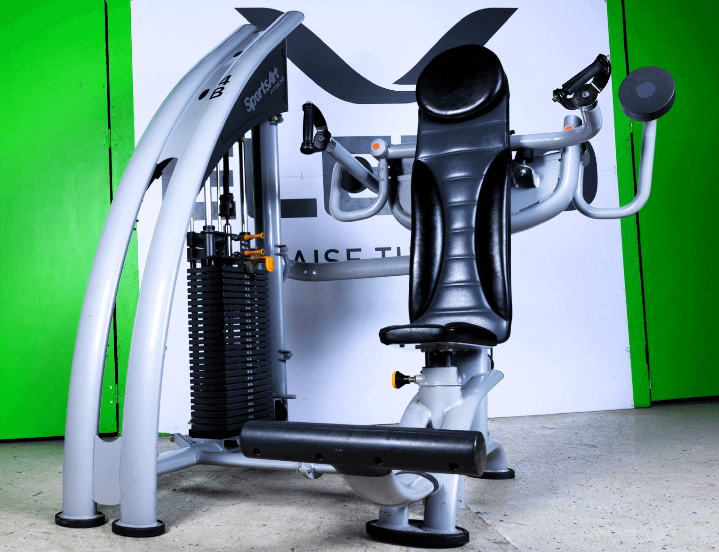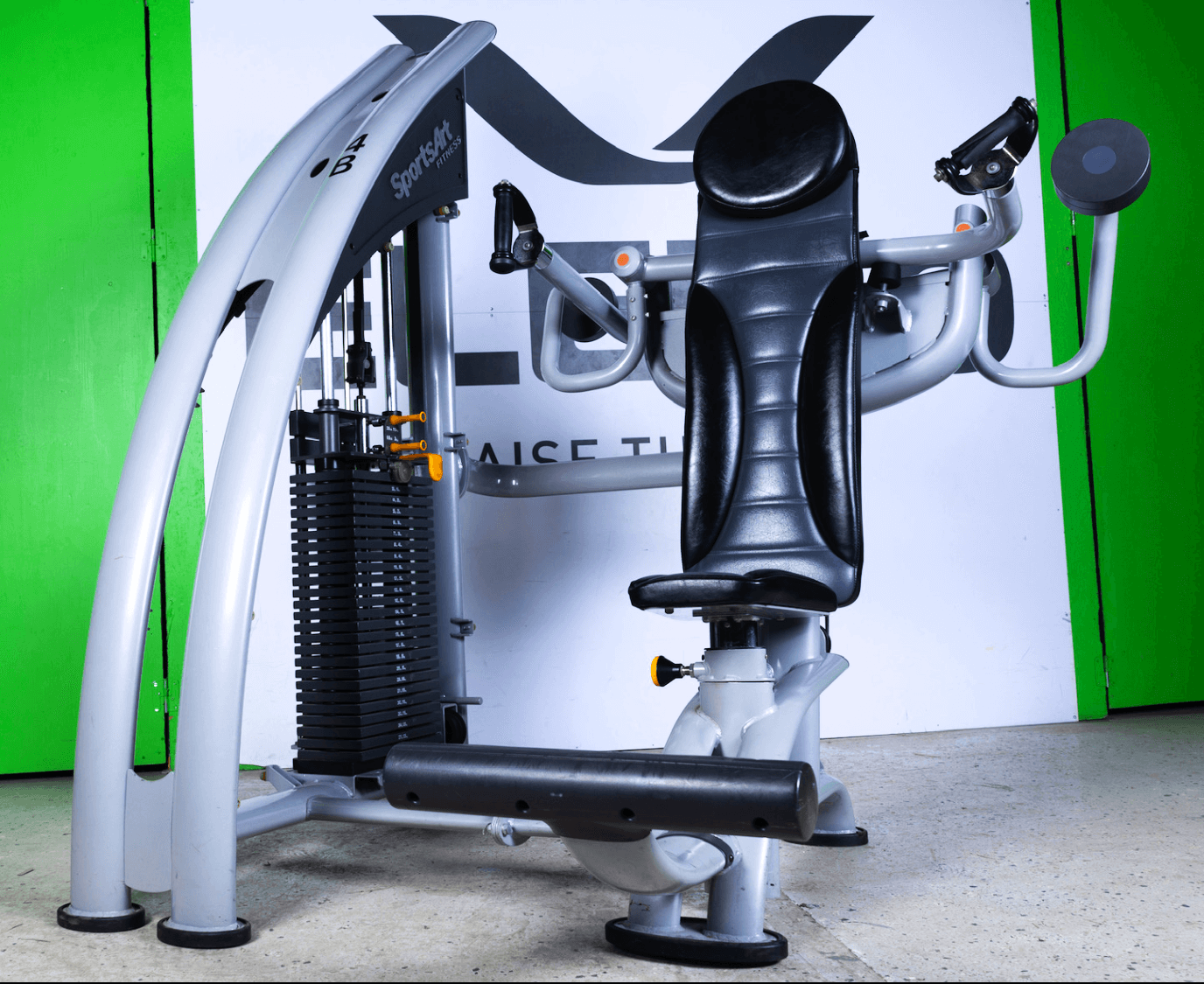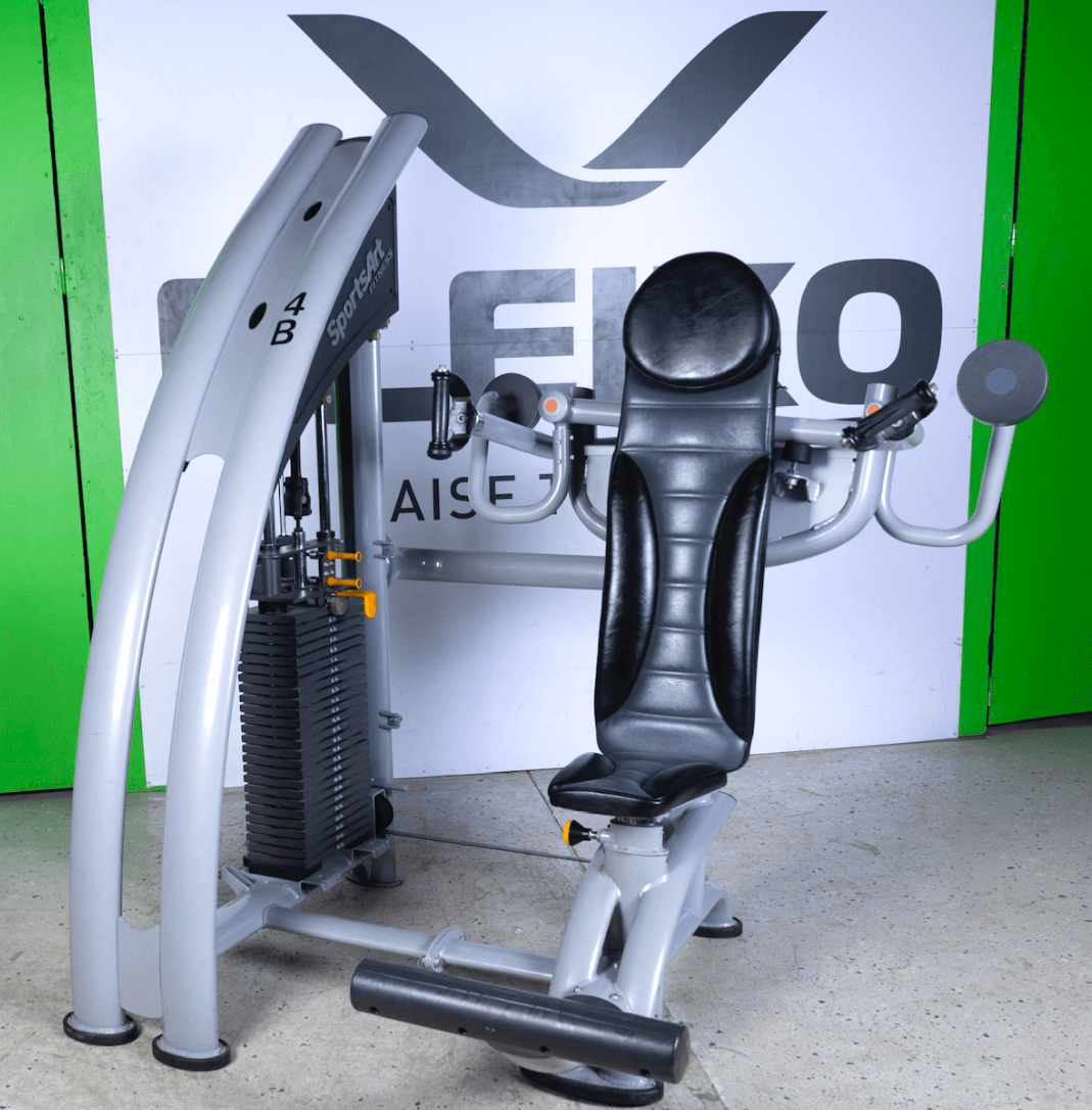 Denna Axelmaskin, Axelpress Sports Art har en linjär rörelsebana, variabelt grepp och justerbar sits. Denna finns med små (91kg) eller stora (113kg) viktmagasin.