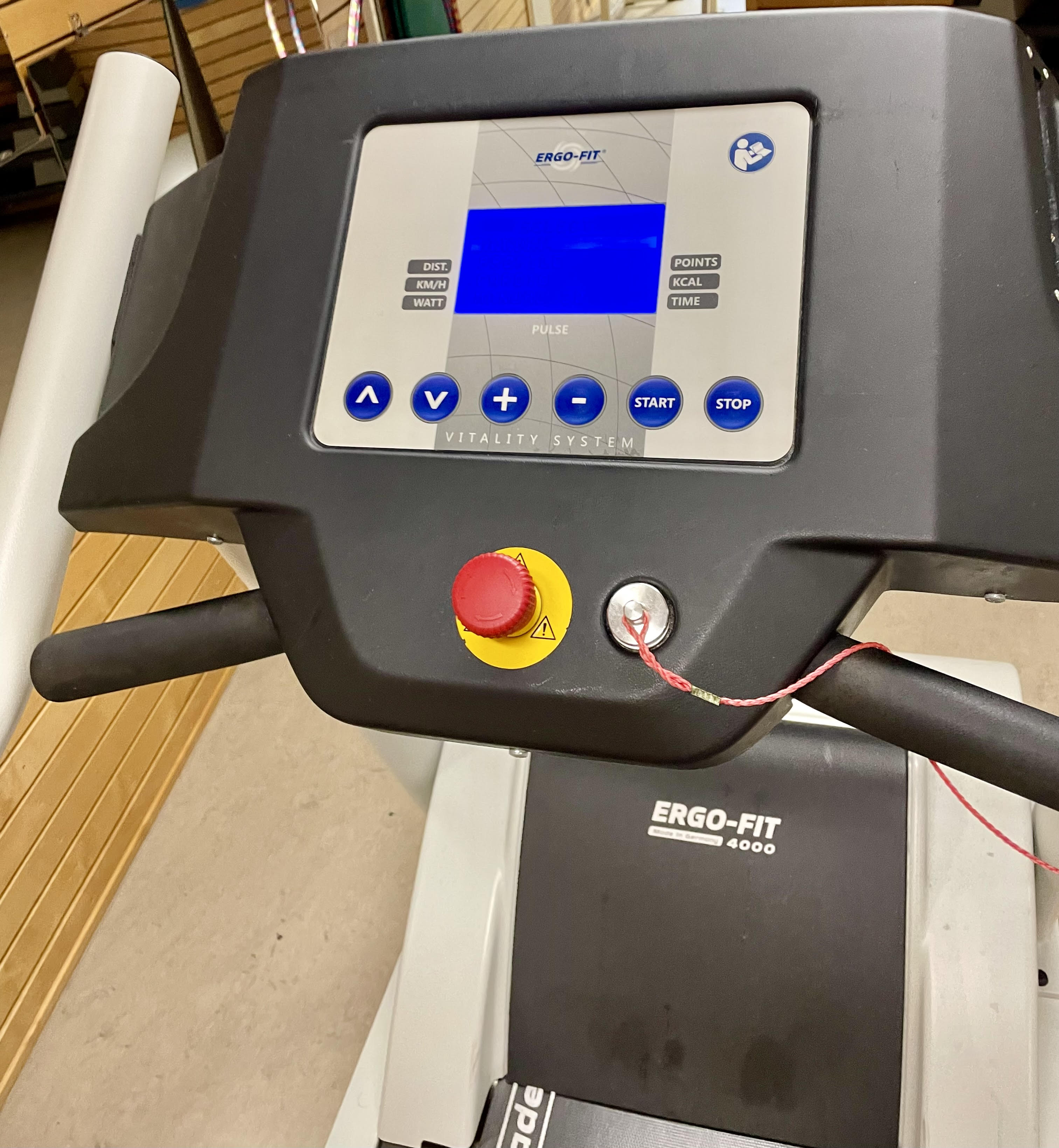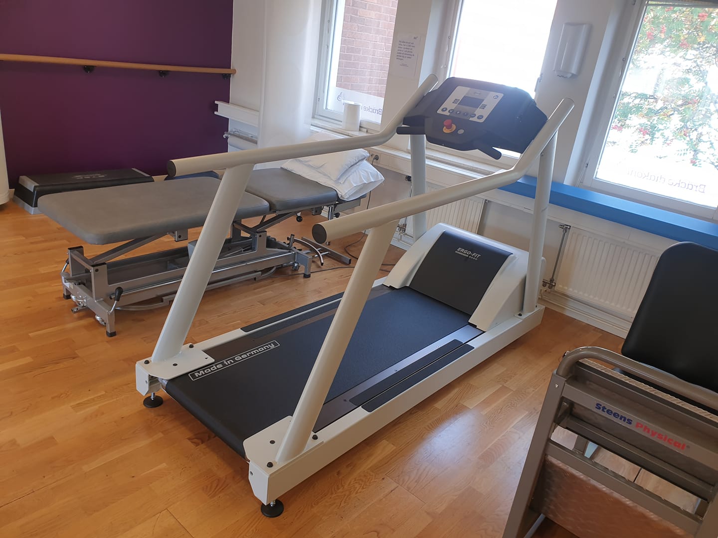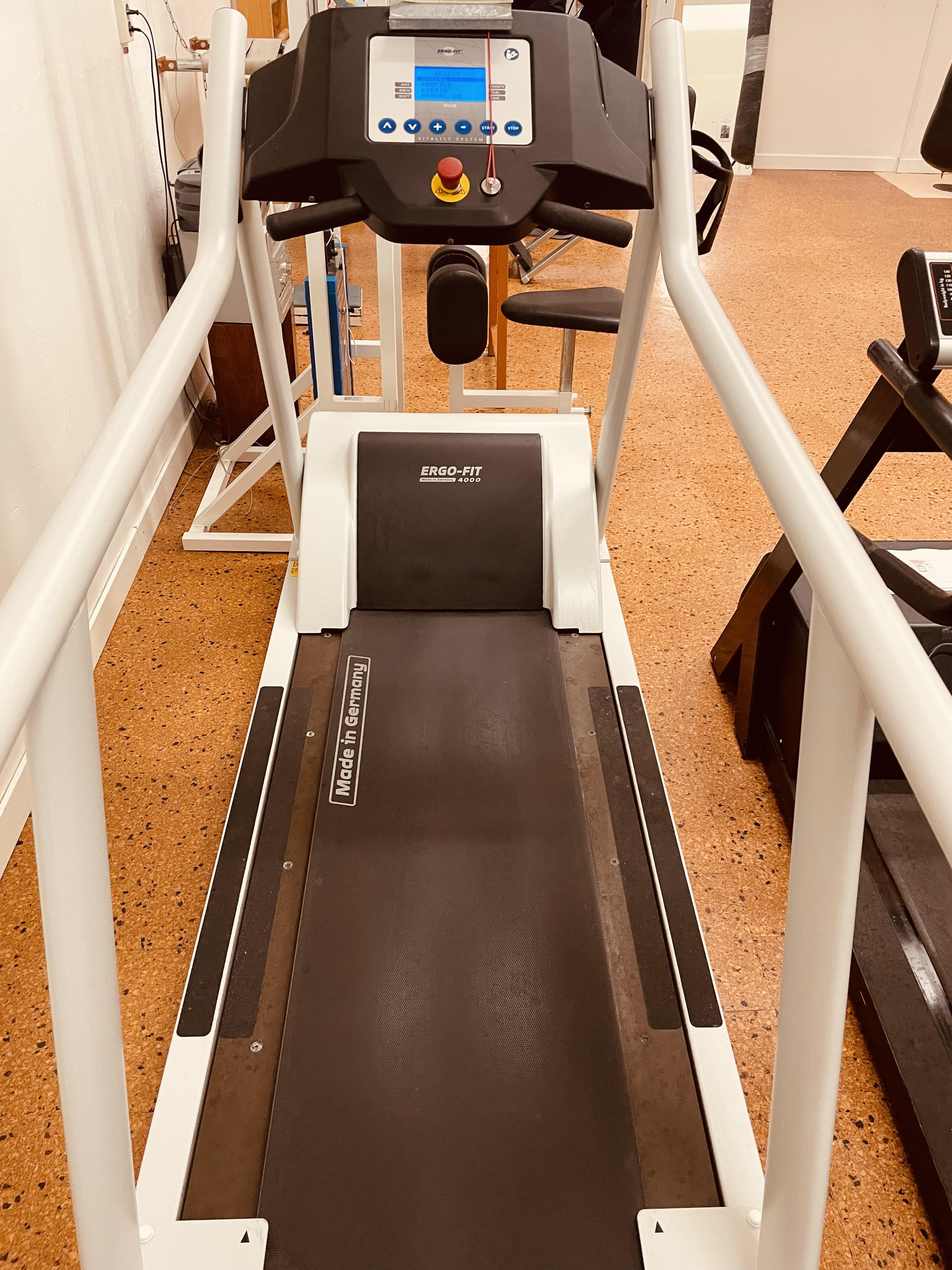Ergo-Fit Löpband Trac Alpin 4000 från rehabavdelning på ett sjukhus. som håller en mycket hög kvalitet och är tillverkat för professionell användning. Detta Löpband passar både på gym och för rehabilitering tack vare de långa handtagen och den låga starthastigheten.