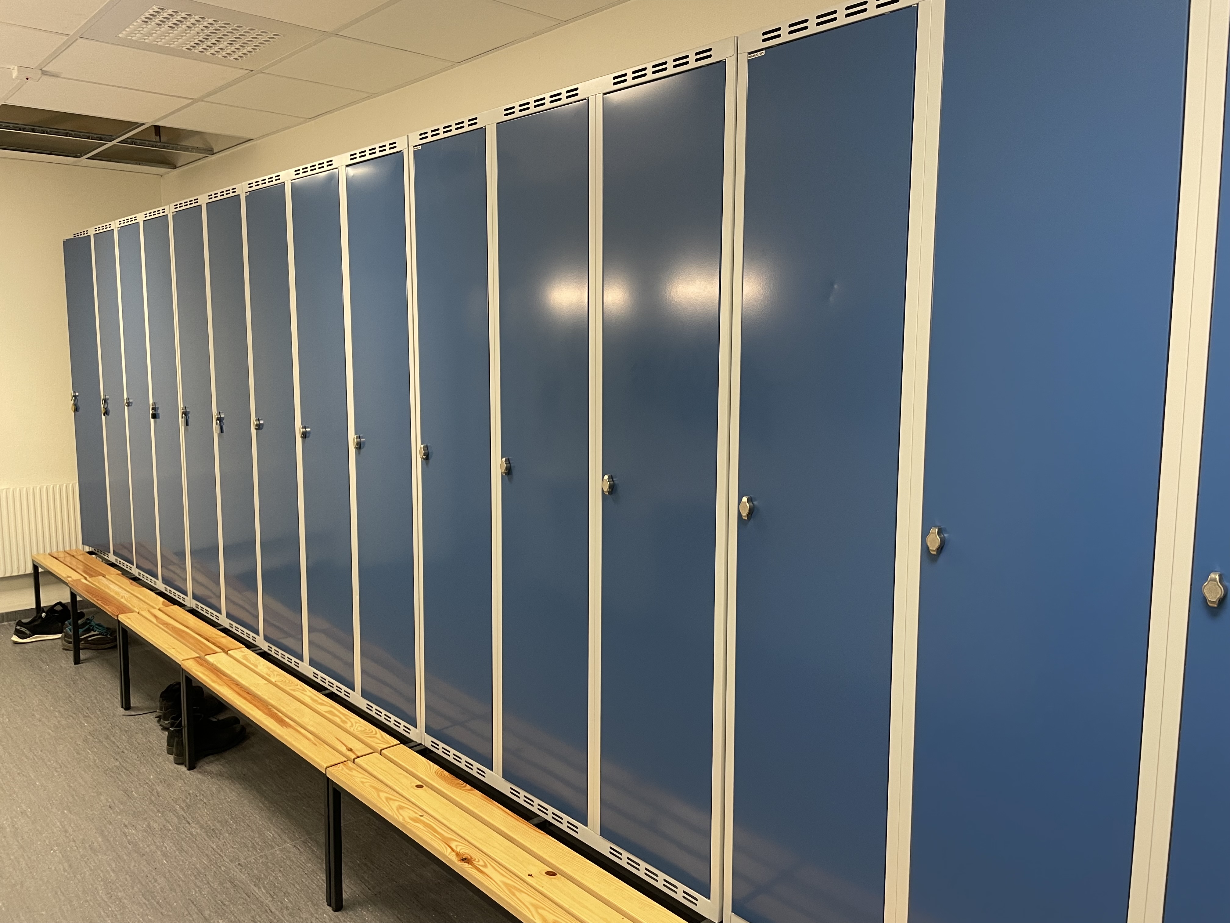 Omklädningsskåp 16 st fullhöjd med bänk- blåa dörrar nyskick