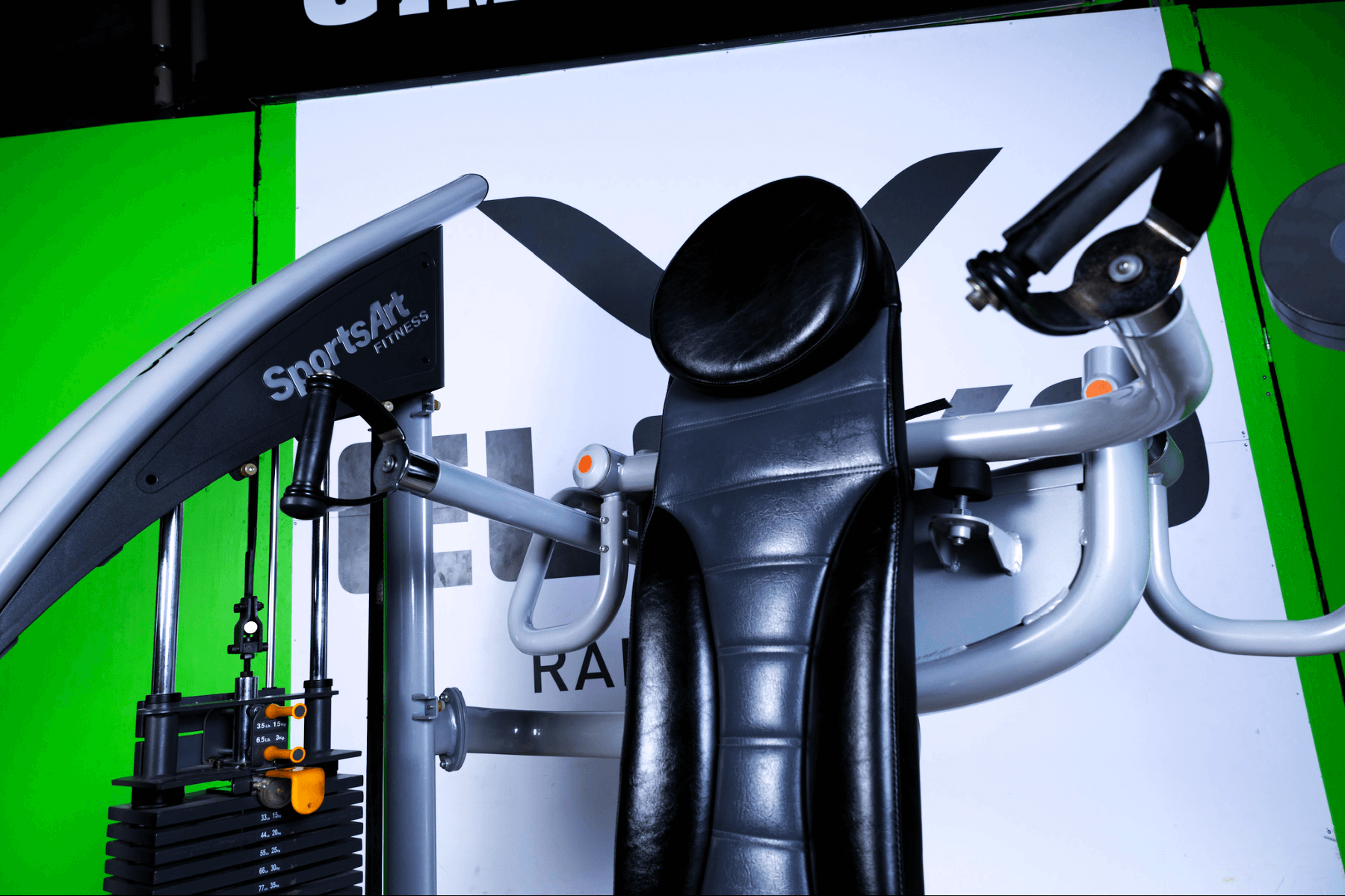 Denna Axelmaskin, Axelpress Sports Art har en linjär rörelsebana, variabelt grepp och justerbar sits. Denna finns med små (91kg) eller stora (113kg) viktmagasin.