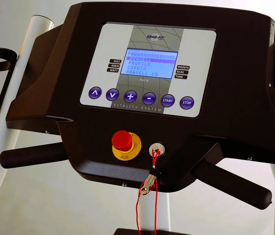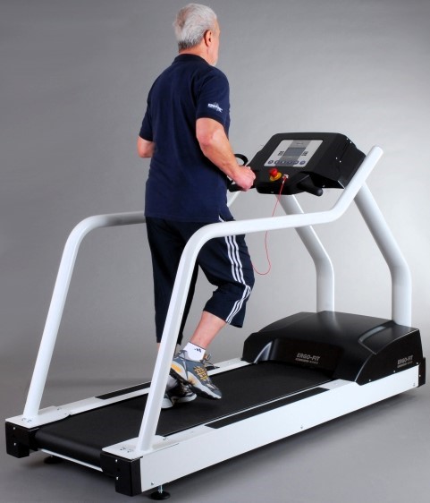 Ergo-Fit Löpband Trac Alpin 4000 från rehabavdelning på ett sjukhus. som håller en mycket hög kvalitet och är tillverkat för professionell användning. Detta Löpband passar både på gym och för rehabilitering tack vare de långa handtagen och den låga starthastigheten.
