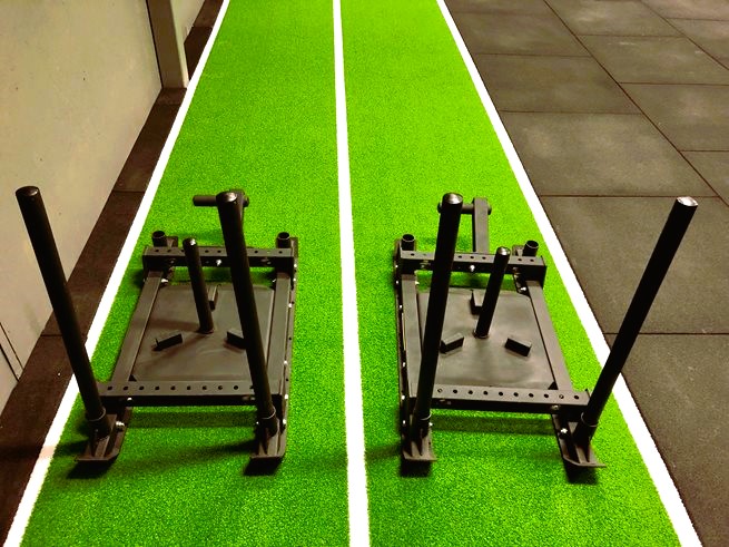 Ett utmärkt och slitstarkt krullat konstgräs 10mm av högsta kvalitet med invävda vita linjer med 2st banor, perfekt för släde och funktionell-träning samt explosiva starter, även TRX och stretching.